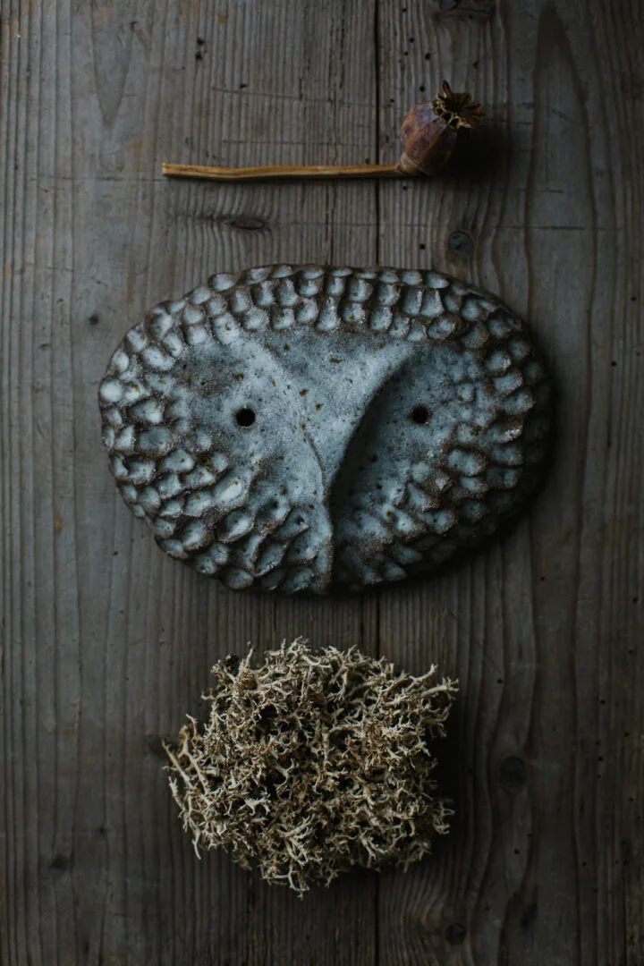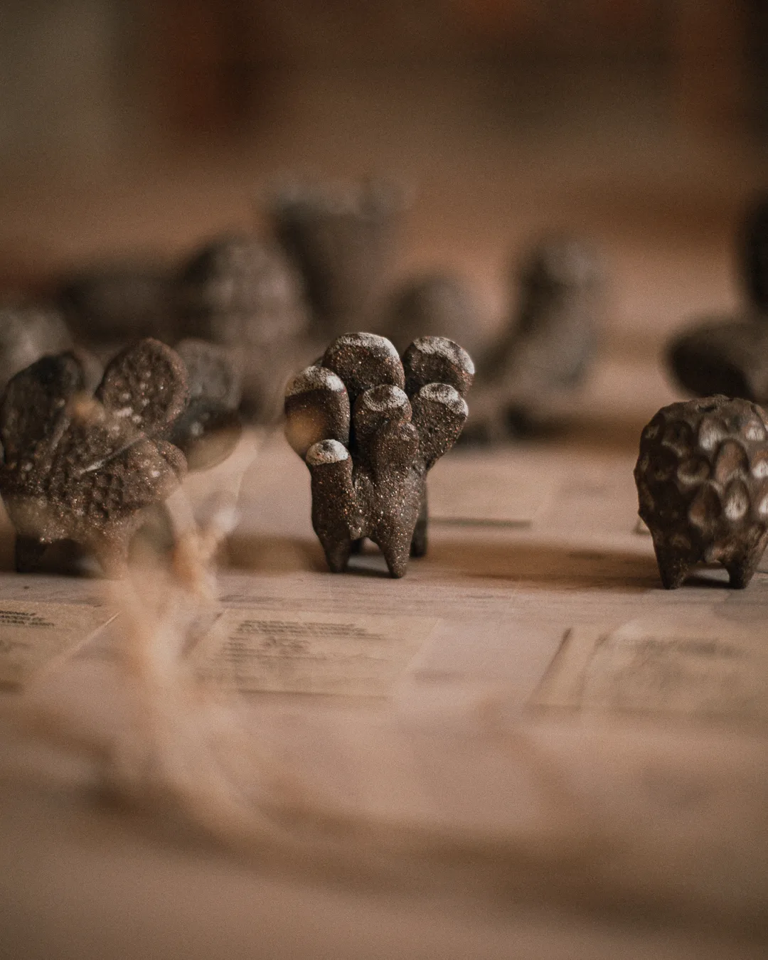 Inspired by flora and fauna, fantasy and primitive art, he slowly shapes the clay he extracts himself locally. He designs and crafts small poetic objects, mysterious creatures and raw-looking pottery.